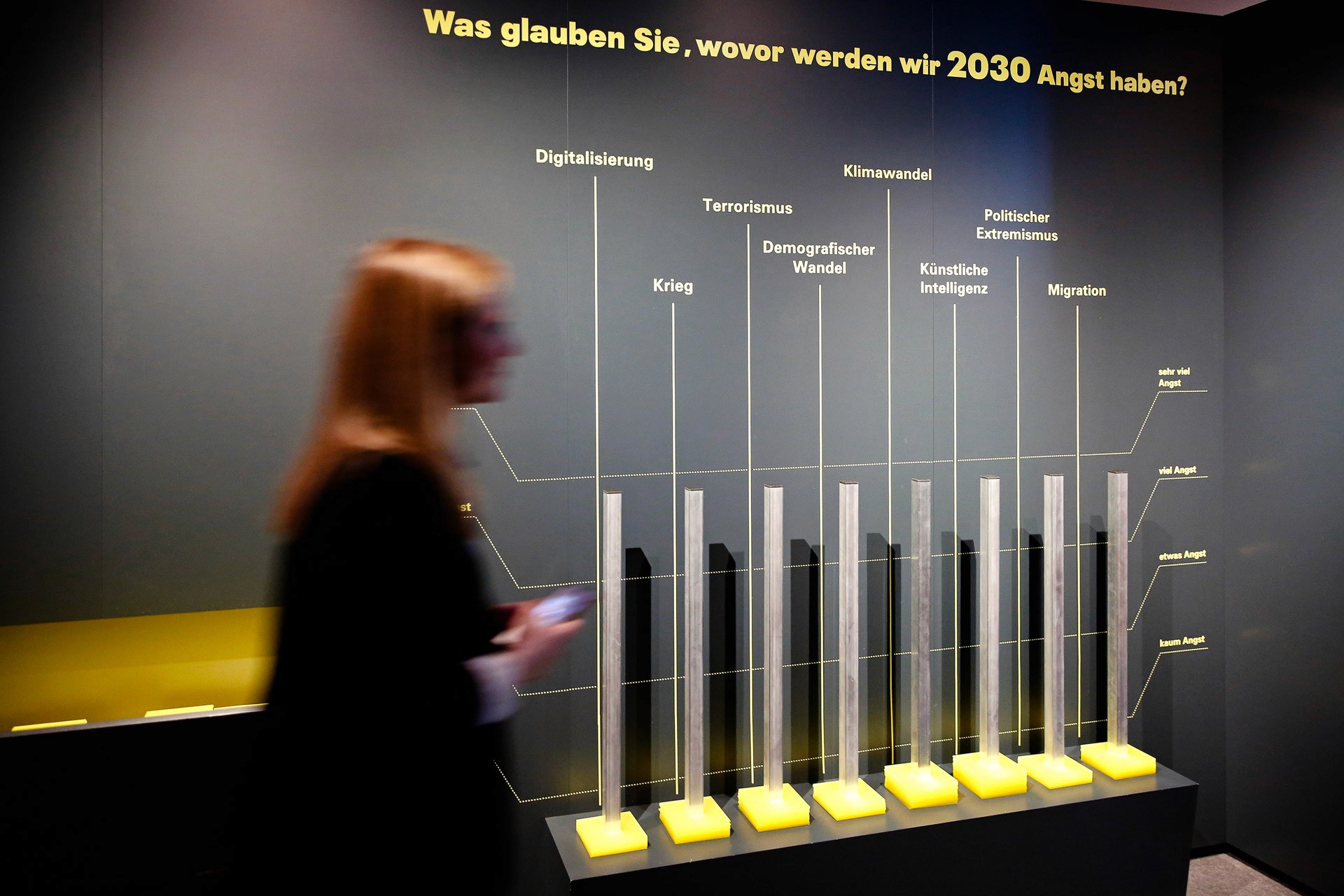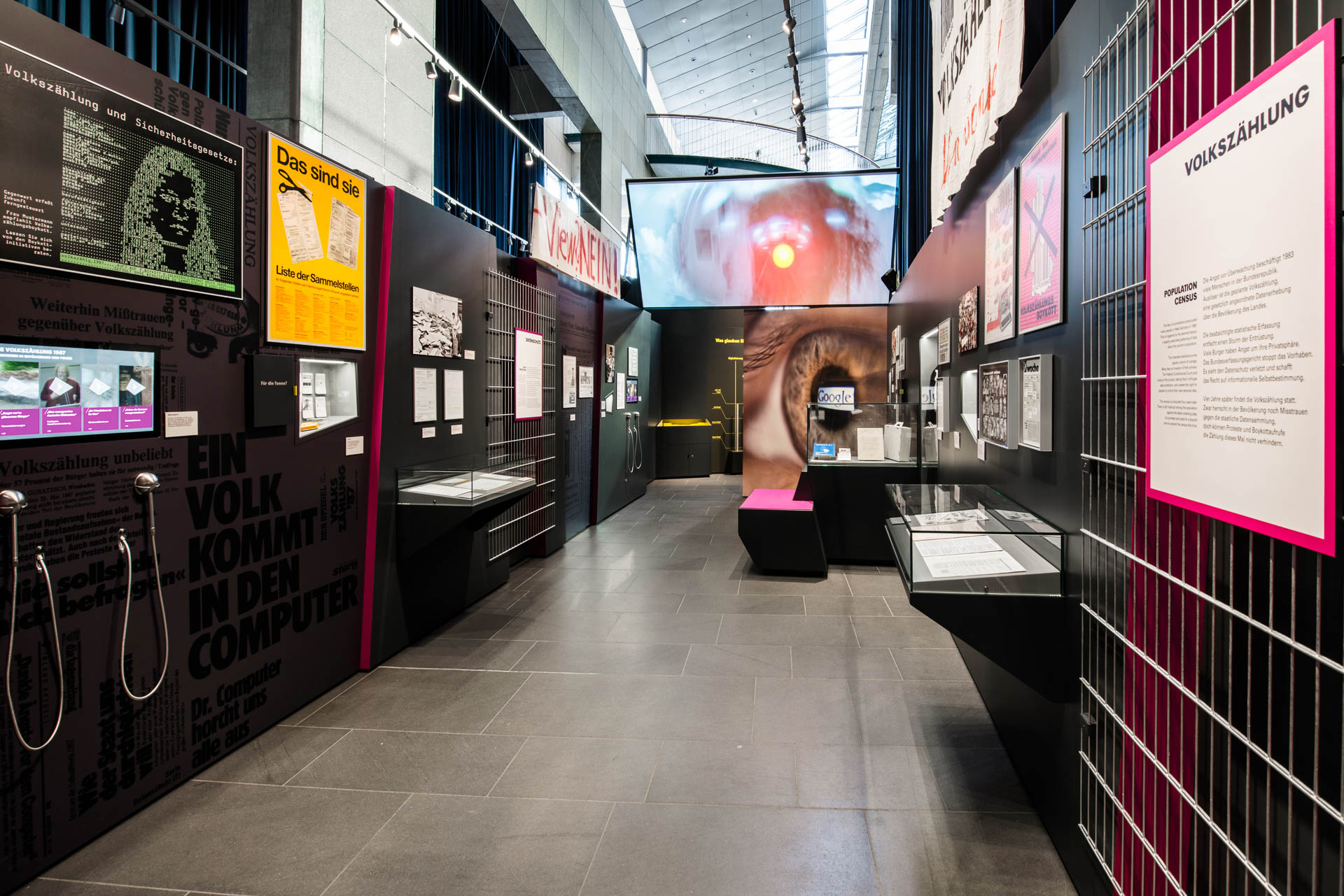 The richly equipped exhibition, which was first shown at the House of History of the Federal Republic of Germany in Bonn and then at the Forum of Contemporary History in Leipzig, deals with the collective fears of Germans after the Second World War over an area of 200m². In four chapters, over 300 objects, pictures, hands-on- and media stations explore the topics: Immigration, Nuclear War, Environmental Destruction and Data Protection. The entrance area is formed by an anamorphosis of the term “ANGST”, a perspective representation that can only be read from a certain point of view and otherwise appears distorted. The individual sections are marked by subtle color accents. Exhibition design: planning adaptation of the exhibition from the Haus der Geschichte in Bonn in execution planning, preparation of the specifications,solicitation of quotations, construction supervision, acceptance and handover process, project management: cost and time management;
