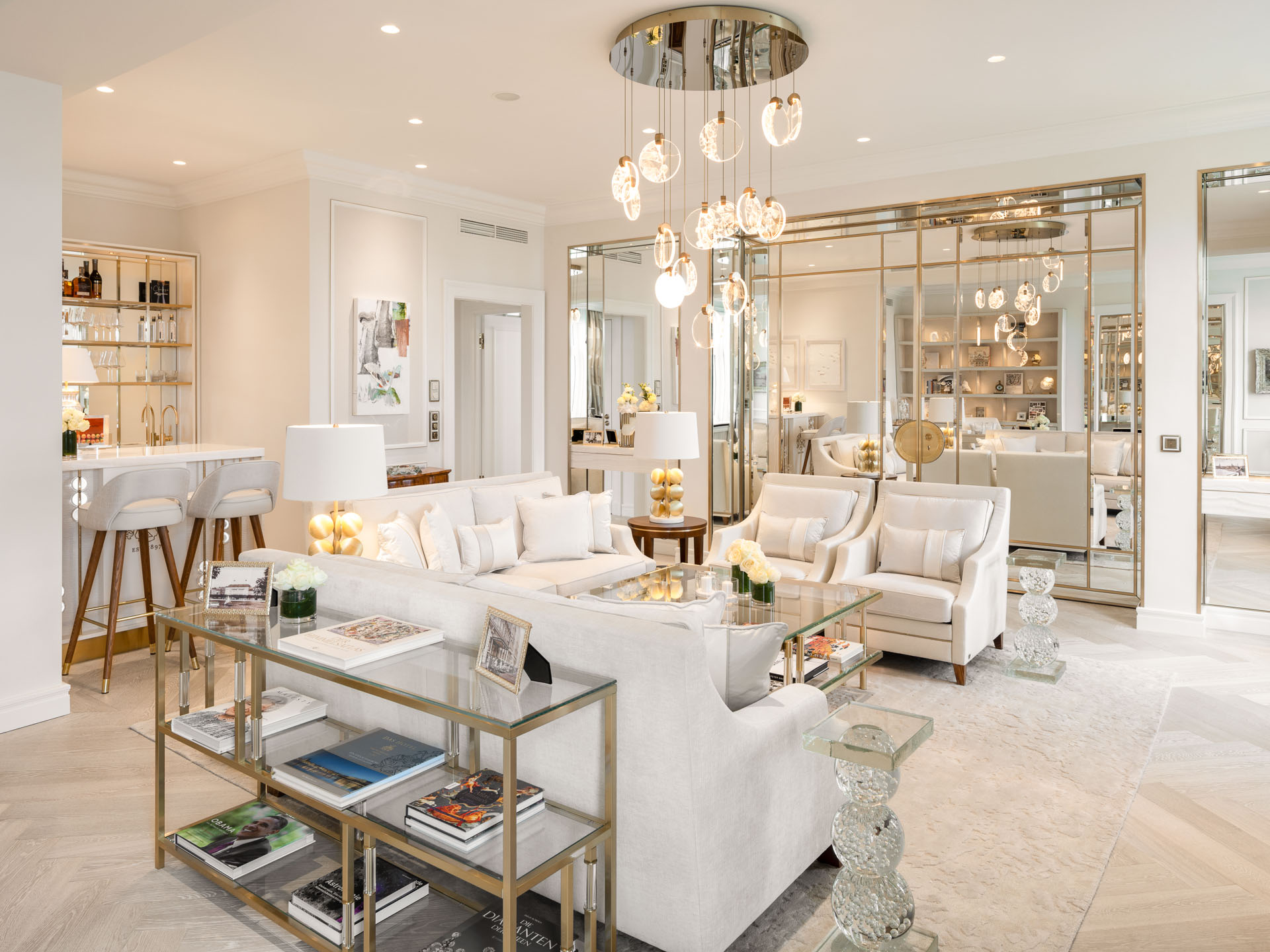 Interior planning and furniture design The luxurious design of the historic reception hall (1897), the presidential suite and the grill restaurant (1926) at the Hotel Vier Jahreszeiten in Hamburg combines high-quality materials, extraordinary objects and fine textiles to create a harmonious ensemble of details, shapes and qualities. All elements have been individually coordinated down to the smallest detail in accurate precision work and composed to create a breathtaking, stylish ambience that offers maximum comfort. The result are carefully designed rooms that create a unique experience for guests by combining classic tradition and elegant modernity. Interior design: design and planning of furnishings, solicitation of quotations, artistic supervision, project management: cost and time management;