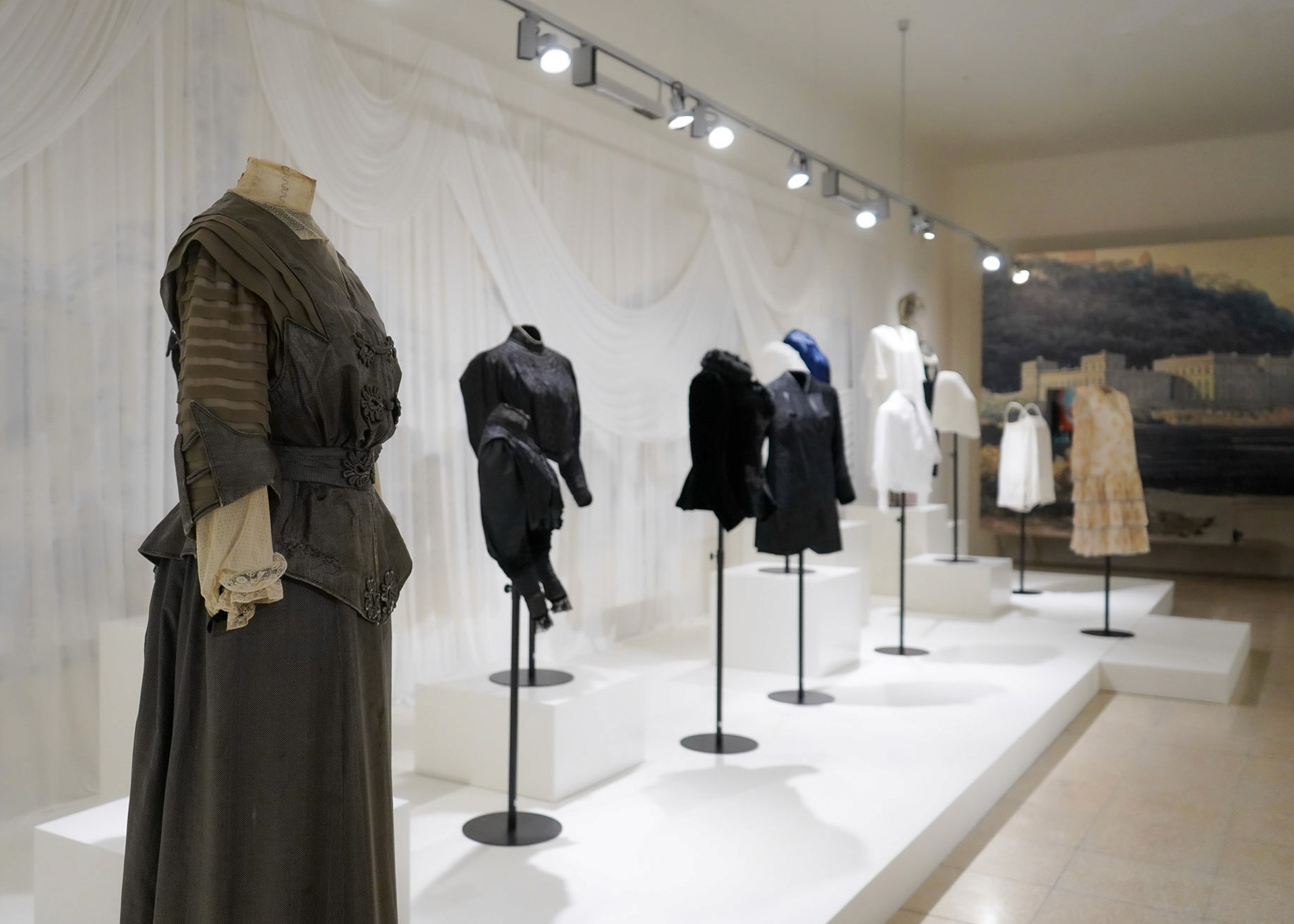 The new special exhibition in the Emperor’s Jubilee Hall of the Kaiser-Franz-Josef-Museum in Baden features historical garments from the Werkmann Collection dating from the late 19th century through the 1920s. The special exhibition space on the first floor of the magnificent Art Nouveau building has been completely redesigned and adapted to meet the conservation requirements of the exhibits. The 110-square-meter space features a calm, bright, and cohesive color scheme that effectively highlights the exhibits’ fine materials and intricate craftsmanship. The exhibits are displayed in redesigned existing display cases and on a new platform landscape. This landscape is designed with varying heights and, thanks to its modular construction, can be easily repurposed. The ensemble is set against a backdrop of gathered fabric panels arranged in multiple layers, which allow an existing illustration of the city of Baden to shine through at specific points. Seating areas and the view from the exposed windows enhance the visitor experience, while an interactive station encourages reflection.