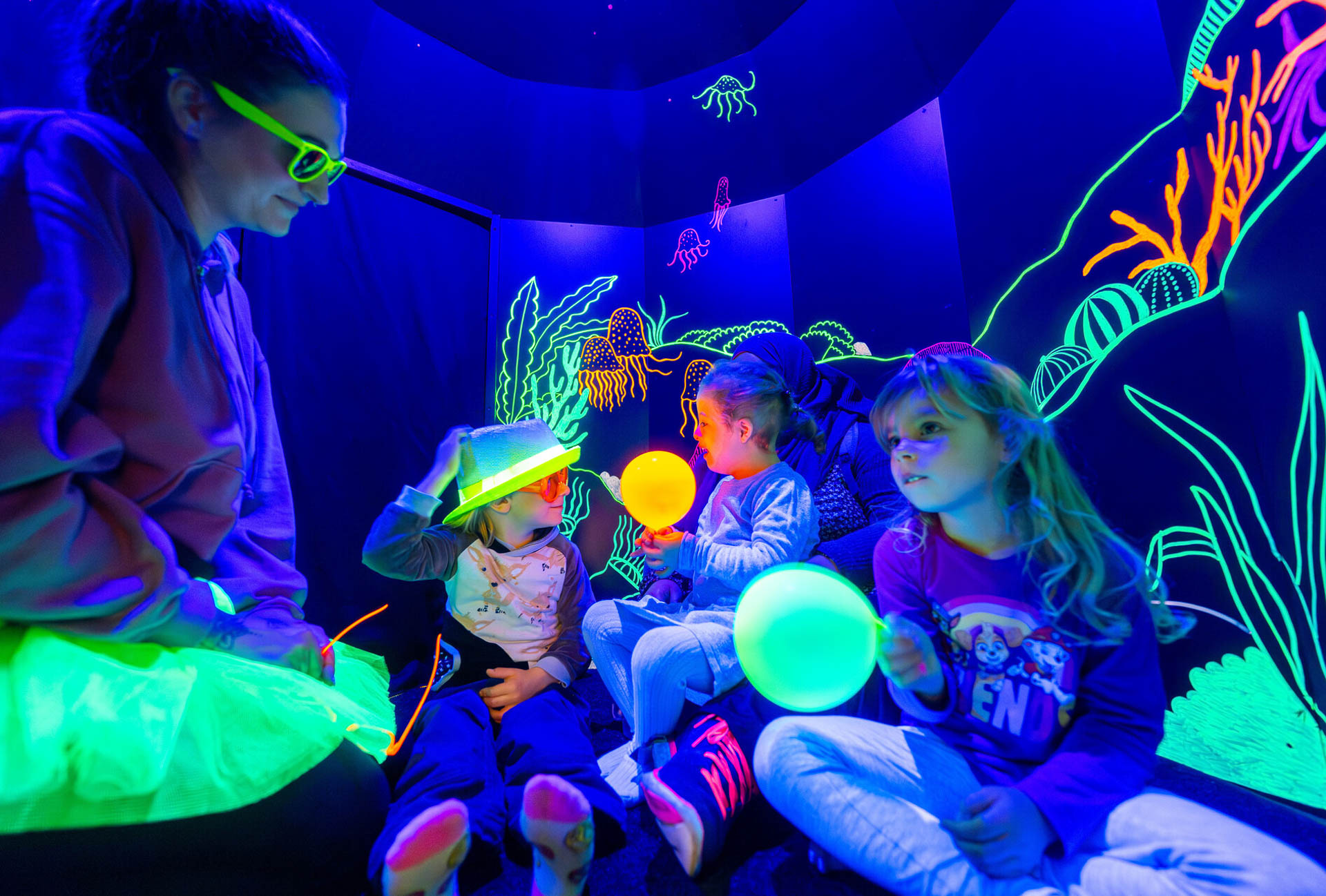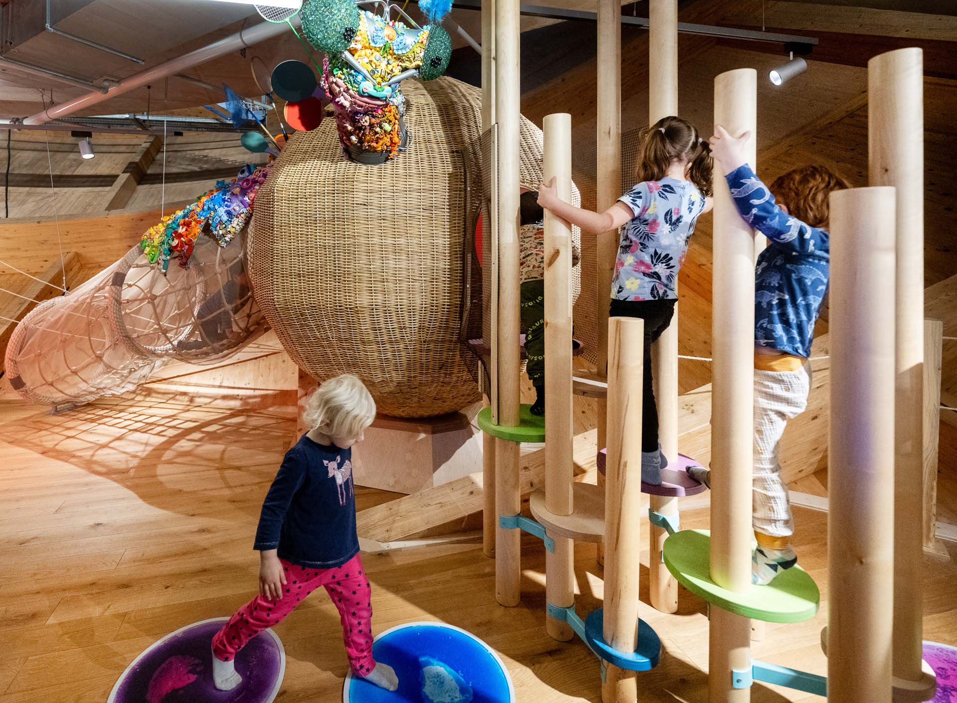 Children's exhibition area "Milky Way" In the newly designed children's area “Milky Way” at Universum® Bremen, five unique worlds, the so-called “supergalaxies”, populated by fascinating creatures, are on their orbit. Across 250m², children aged three to eight can explore exciting phenomena at 30 interactive stations, discover thrilling connections and test a wide range of teamwork skills. They can immerse themselves in mysterious universes, climb colorful worlds, experience their reflection in 1,000 pieces, set balls on a crooked slopes, snuggle up in a wonderfully soft landscape and much more. The exhibition architecture consists mainly of natural materials such as untreated birch wood, wicker and sustainable textiles. Large-format abstract murals fill the walls and embed the scenography in expansive worlds. The creatures that live in the “Milky Way” are made from recycled toys and, like chameleons, are color-matched with the respective world. Exhibition design: preliminary design, design planning, execution planning, preparation of specifications, project, cost and time management;