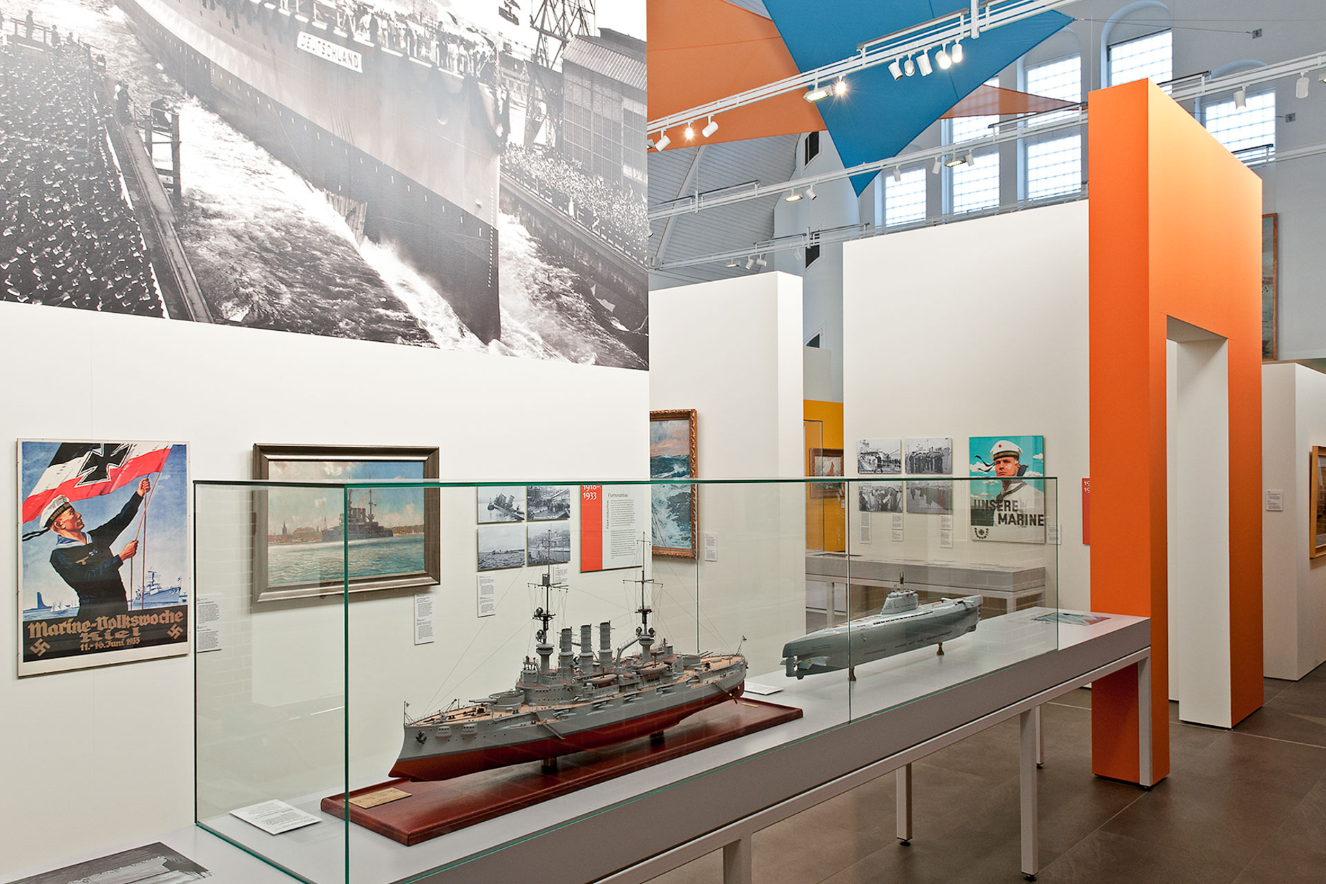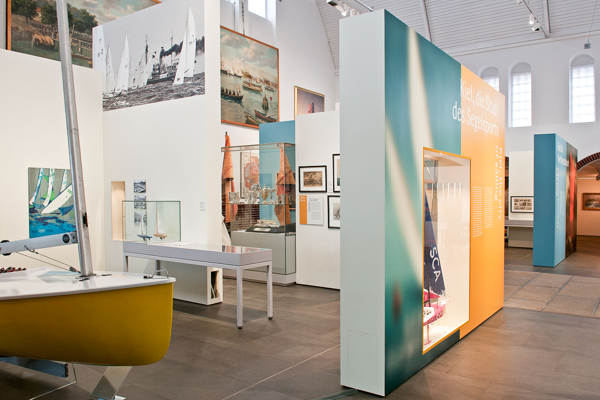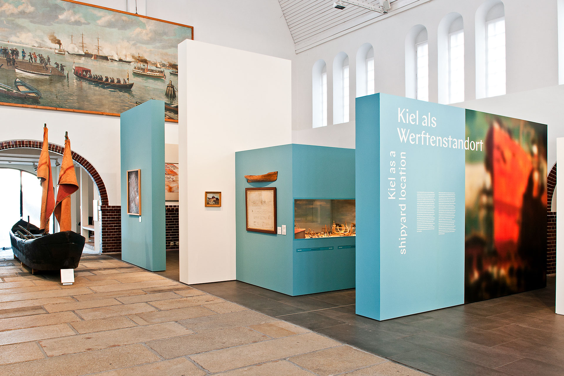 The City and Maritime Museum Kiel is one of the city's most representative buildings and is located directly on the fjord. Built in 1909, the Fischhalle (Fish Hall) presents Kiel's history as a port, navy and shipyard location as well as a place of sailing in a vivid way on 900m² and with over 800 objects. The historic Fischhalle has been divided thematically and spatially into four exhibition areas in different colors. Kiel as a naval location, port city, shipyard location and city of sailing. The scenography is strongly oriented towards the existing building and fits in with the existing axes and paths. Free-standing exhibition walls that reach into the airspace were designed as spatial cubatures and interact with the colorful sails that fill the airspace below the hall ceiling. As a graphic leitmotif, four historical paintings from the museum collection were visually altered and used to design wall surfaces and the exterior walls of the chapters. Together with the Control center for people with disabilitiesd, an inclusion concept was developed with a focus on visually and hearing impaired people. Exhibition design: concept sketch, preliminary design, design planning, execution planning, preparation of specifications, solicitation of quotations, counseling in the awarding of contracts, construction supervision, acceptance and handover process, project management: cost and time management, accessibility and inclusion concept;